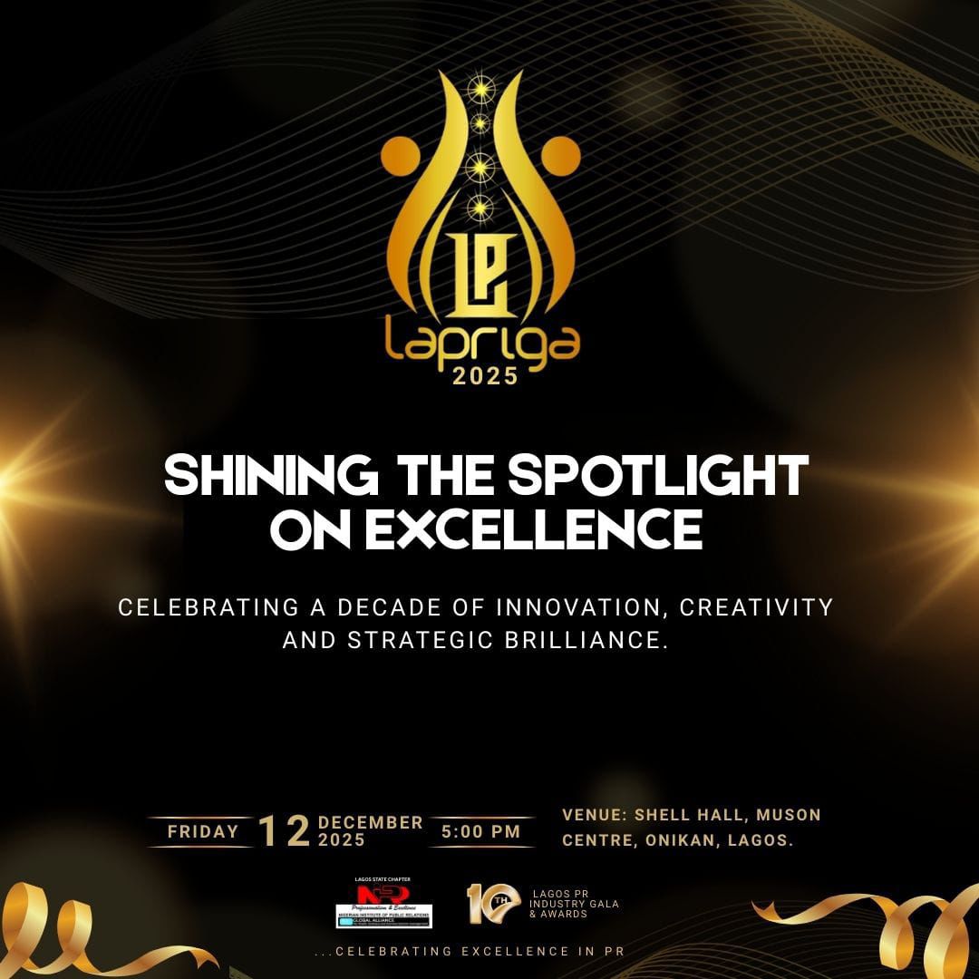 The Lagos State Chapter of the Nigerian Institute of Public Relations (NIPR) proudly announces that all arrangements have been fully concluded for the highly anticipated 2025 Lagos PR Industry Gala & Awards (LaPRIGA). The prestigious ceremony will hold on Friday, December 12, 2025, at the MUSON Centre, Onikan, Lagos.