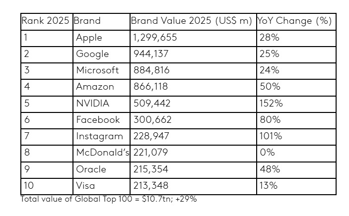 Apple has a brand value of $1.3 trillion, hence, it retains its top position for the fourth year. It represents more than 12% of the total value of the Global Top 100, while Amazon’s brand value has surged by 50% to $866 billion, driven by its strong emphasis on convenience and affordability, which has enabled it to flourish despite economic challenges.