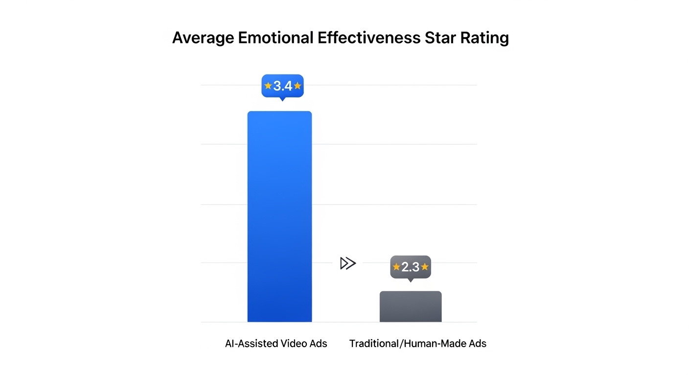 Their test may be small, but the signal is strong. They evaluated 18 AI-assisted video ads, ranging from big-brand work to one-off creative experiments, and measured emotional impact using System1’s star-rating system. The results were clear. The AI ads averaged 3.4 stars, outperforming more than 123,000 traditional ads, which averaged 2.3 stars.